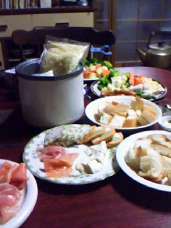 見難いけど奥にある鮮やかな緑の奴がフォンデュの具材です。